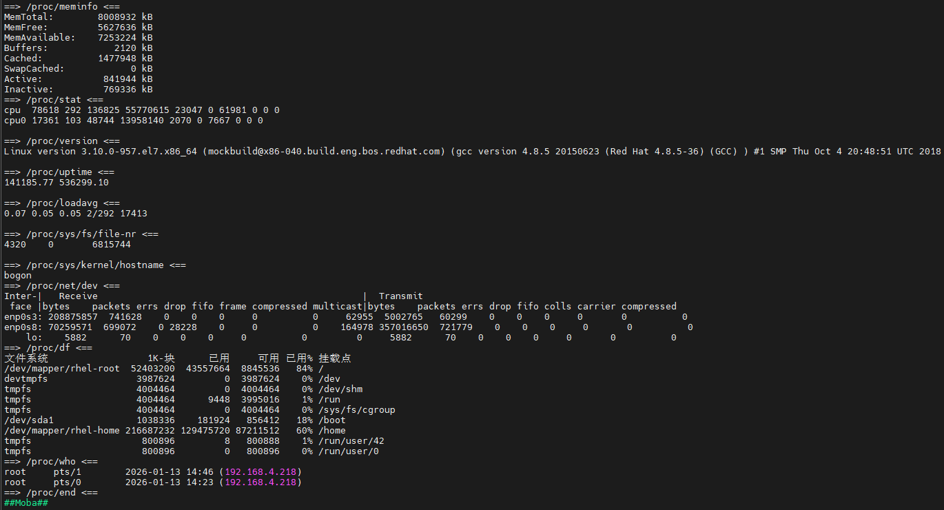 bash -c while true; do sleep 1; head -v -n 8 /proc/meminfo; head -v -n 2 /proc/stat /proc/version /proc/uptime /proc/loadavg /proc/sys/fs/file-nr /proc/sys/kernel/hostname; tail -v -n 32 /proc/net/dev;echo '==> /proc/df <=='; df -l; echo '==> /proc/who <=='; who; echo '==> /proc/end <=='; echo '##Moba##'; done