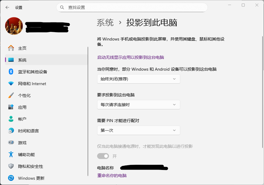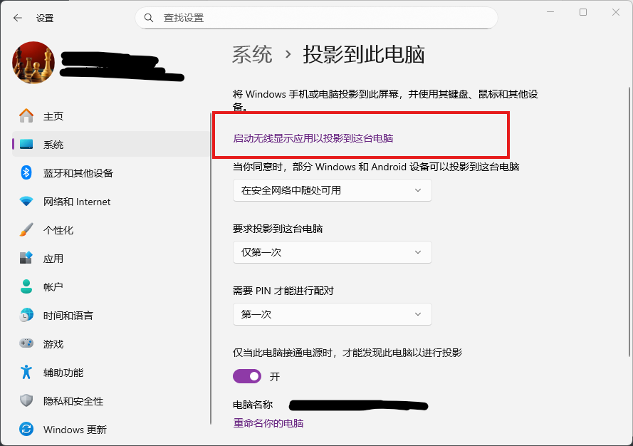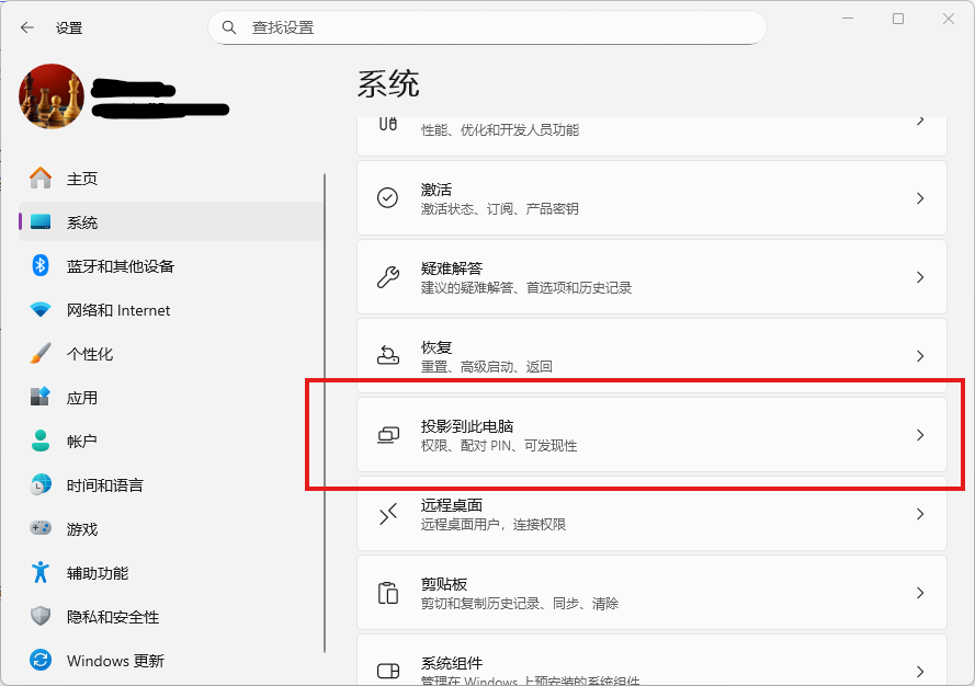 以上步骤完成后,Windows的投屏功能已经安装。返回设置界面,再次进入:设置 → 系统 → 投影到此电脑。