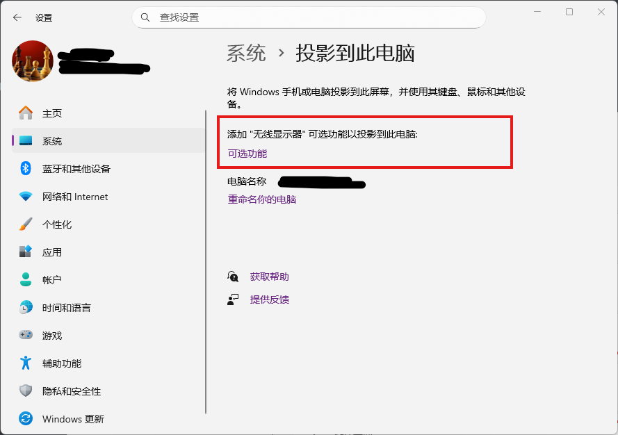 (2)在“投影到此电脑”页面,点击“可选功能”。
