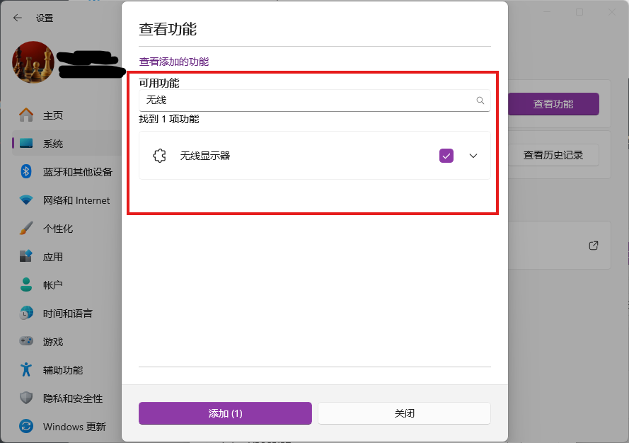 (5)然后在“可用功能”搜索框内输入“无线”关键词,下面会列出“无线显示器”功能,勾选之,点击“添加(1)”按钮。