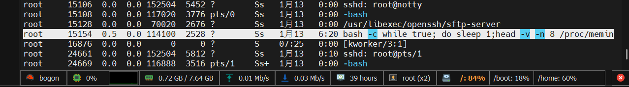 bash -c while true; do sleep 1; head -v -n 8 /proc/meminfo; head -v -n 2 /proc/stat /proc/version /proc/uptime /proc/loadavg /proc/sys/fs/file-nr /proc/sys/kernel/hostname; tail -v -n 32 /proc/net/dev;echo '==> /proc/df <=='; df -l; echo '==> /proc/who <=='; who; echo '==> /proc/end <=='; echo '##Moba##'; done